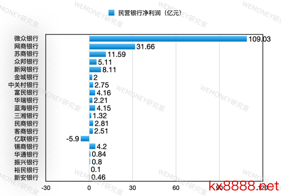 从净利润数据来看,19家银行中仅一家损失。微众银行完方正利润109.03亿元,微增0.81%,网商银行和苏商银行位列第二、三位,净利润划分为31.66亿元和11.58亿元,裕民银行净利润虽不足1000万元,但同比完了103.46%的增长。从净利润增速看,包括新网银行、中关村银行、振兴银行等在内的9家民营银行净利润同比着落。